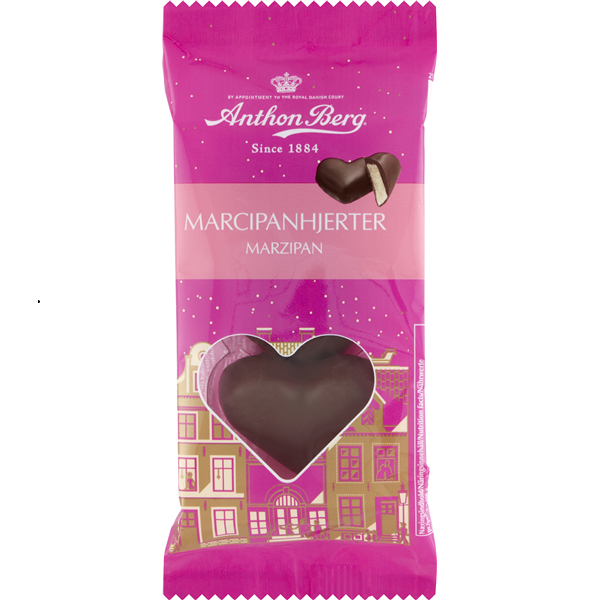 Premium AB marcipan hearts, enrobed in lush dark chocolate.